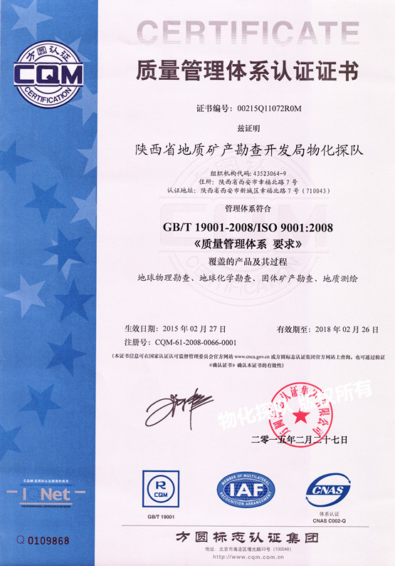 ? ? 我隊于2015年2月27日獲得了方圓標志認證集團有限公司認可的質量管理體系(換版認證)〔GB/T19001-2008〕、環境管理體系〔GB/T24001-2004〕、職業健康安全管理體系〔GB/T28001-2001〕三大認證證書。