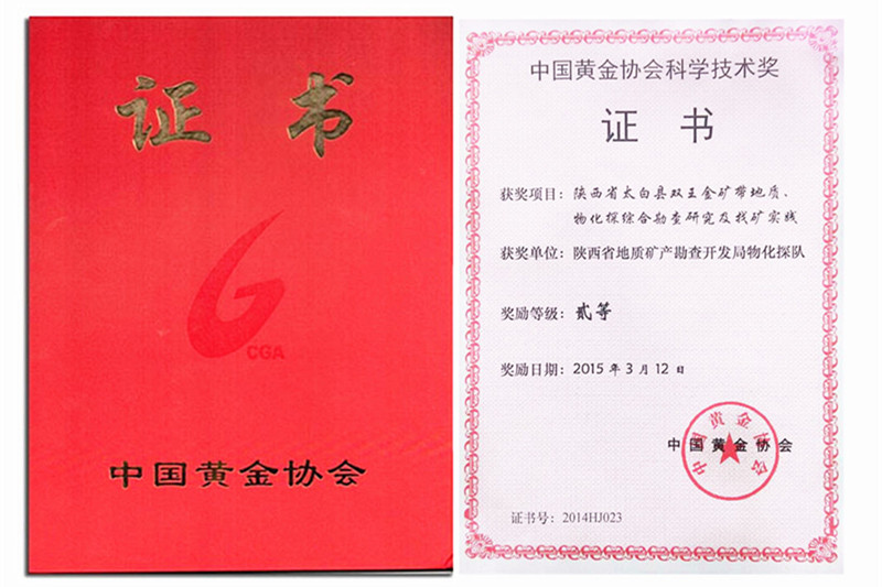 ? ? 物化探隊承擔的2014年完成的“陜西省太白縣雙王金礦帶地質、物化探綜合勘查研究及找礦實踐”項目,榮獲中國黃金協會頒發的“科學技術二等獎”。同時獲此殊榮的個人有項目負責毛軍衛、技術負責馮旭輝、技術員劉昊培。